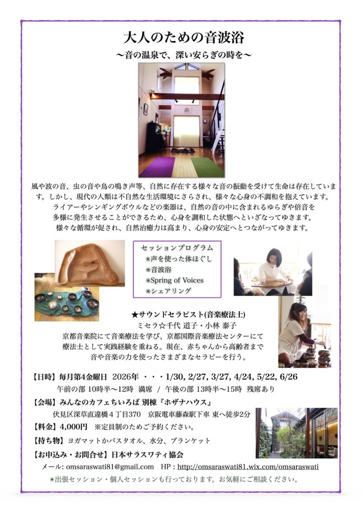 大人のための音波浴 イベント詳細 このイベントは 30 1月 2026 から 26 6月 2026 まで開催しています。 次回の開催は 2026年3月27日 です。 カテゴリ: 日本サラスワティ協会 開催日: 2026年3月27日2026年4月24日2026年5月22日2026年6月26日 お問い合わせ・お申し込みは、 日本サラスワティ協会まで omsaraswati81@gmail.com http://omsaraswati81.wixsite.com/omsaraswat